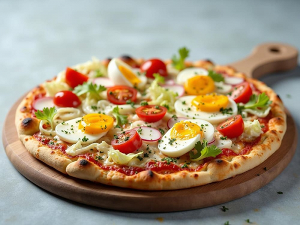Вершки, моцарелла, підчеревок, куряче філе, перепелине яйце, помідор черрі, соус часниковий, зелень
